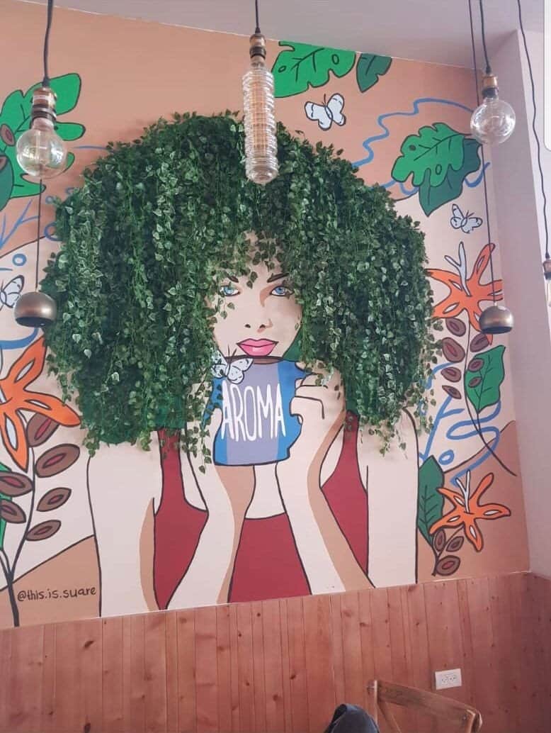 שילוב של צמחייה נשפכת על ציור קיר- "ארומה"